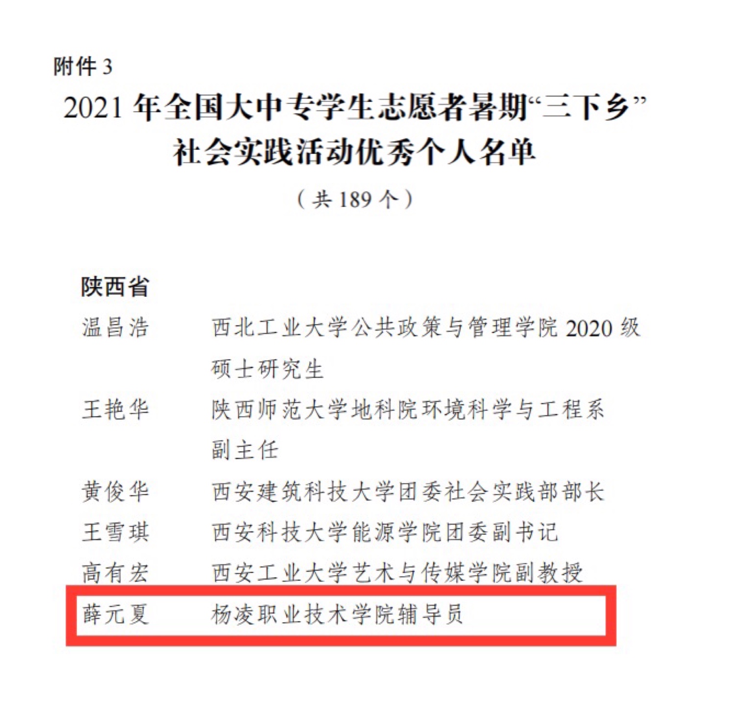 近日,团中央表彰了2021年全国大中专学生志愿者暑期文化科技卫生“三下乡”社会实践活动的集体和个人,学校辅导员薛元夏荣获2021年全国“三下乡”社会实践活动优秀个人,这是学校首次在“三下乡”社会实践活动方面获得的国家级荣誉。