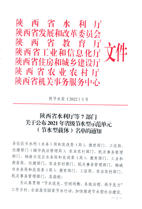 近日,陕西省水利厅公布了2021年省级节水型示范单元(节水型载体)评选结果,经自评申报、示范区核查评估、省水利厅复核、网上公示等程序,我校被评为省级节水型高校。
