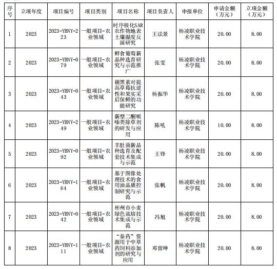 项目申报过程中我校科教处积极动员、广泛宣传,经过项目负责人申报、科教处审核、杨凌示范区科技局推荐,共申报项目35,最终获批12项。其中,陕西省自然科学基础研究计划面上项目青年项目2项,陕西省重点研发计划一般项目8,共获批经费84万元,项目立项数与经费数均创历史新高。