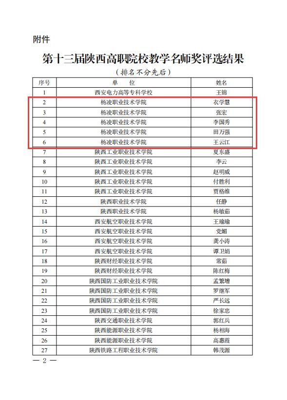 近日,省教育厅公布了关于表彰第十三届陕西高职院校教学名师奖获奖教师的通知,我校衣学慧、张宏、李国秀、田万强、王云江5位教授获评第十三届陕西高职院校教学名师奖。