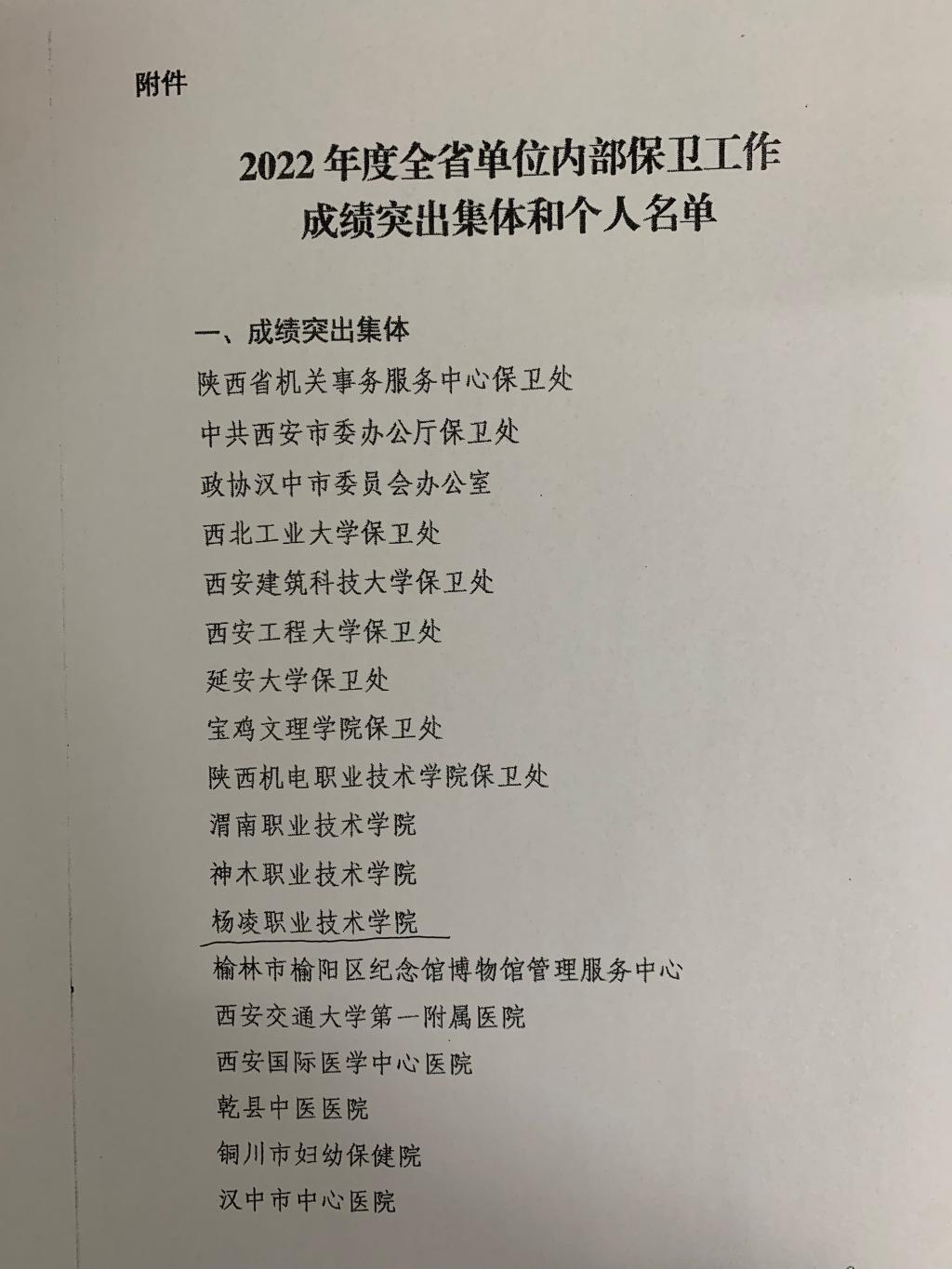 近日,陕西省公安厅对2022年度全省单位内部保卫工作成绩突出集体和个人予以通报表彰,我校荣获2022年度全省单位内部保卫工作成绩突出集体称号。
