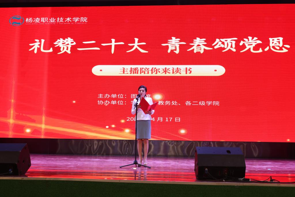 4月17日下午,我校“4·23世界读书日”系列活动启动仪式暨“礼赞二十大 青春颂党恩”主播陪你来读书朗诵活动在南校区一卡通中心举行。副校长祝战斌,超星集团西安分公司行政人事部总经理马云志,西安广播电视台主任记者张曦元,杨凌农科传媒集团通联部主任李慧,以及学生处、教务处、图书馆负责人等参加活动。