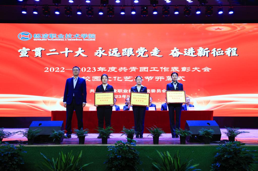 大会分为表彰大会、文艺汇演两个阶段。在表彰大会上,张朝晖宣读了《共青团杨凌职业技术学院委员会关于表彰2022-2023学年度先进集体及先进个人的决定》,学校领导为五四红旗团委、五四红旗团支部、优秀共青团干部、优秀共青团员等先进集体和个人颁奖。35名新发展团员代表进行了入团宣誓仪式。