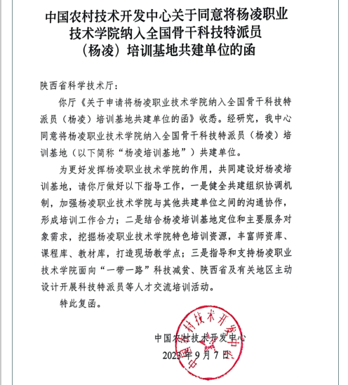 近日,科学技术部中国农村技术开发中心同意将我校纳入全国骨干科技特派员(杨凌)培训基地共建单位,这是我校培训基地建设工作的又一重大突破。
