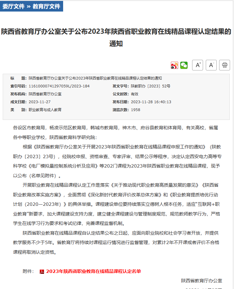 1128日,省教育厅发布2023年陕西省职业教育在线精品课程认定结果,我校刘晓瑞、董滢、武荣、黄从玲、陈高锋、闫红军、王春梅、纪娜、刘鑫尚、李博、龙明华和芦琴等12名老师负责的课程获评,认定总数和比例均居全省高职院校前列。