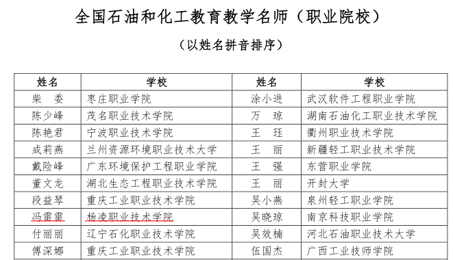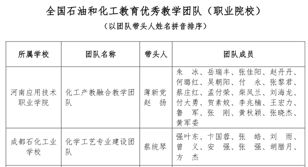近日,中国化工教育协会公布了2023年全国石油和化工教育教学名师、优秀教学团队、优秀教学管理人员评选结果,我校周博教授带领的药品生产技术教学团队荣获“全国石油和化工教育优秀教学团队(职业院校)”称号,冯雷雷副教授荣获“全国石油和化工教育教学名师”称号。