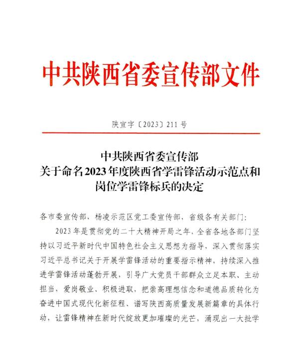 近日,省委宣传部公布2023年度陕西省学雷锋活动示范点和岗位学雷锋标兵名单,杨凌职业技术学院教师高睿荣获“陕西省岗位学雷锋标兵”称号。
