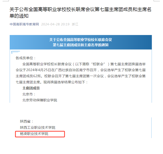 学校入选全国高等职业学校校长联席会议第七届主席团成员