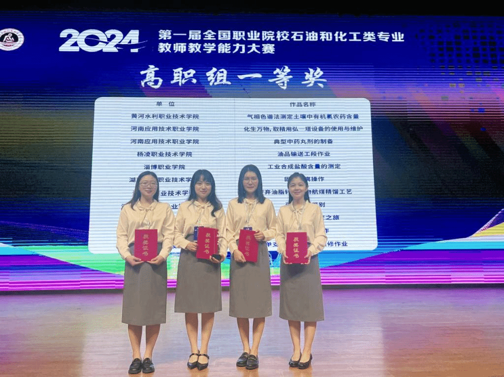 7月27日至29日,2024年首届全国职业院校石油和化工类专业教师教学能力大赛在河南应用技术职业学院举办。我校由药物与化工学院白洁、梁晓彤、杨子琪、李博组成的教师团队凭借深厚的理论功底、精湛的教学技能和较高的专业素养,从来自全国各地的73支参赛队伍中脱颖而出,斩获大赛一等奖。