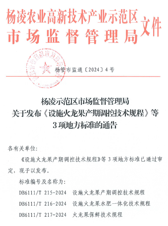 这三项地方标准由杨凌示范区市场监督管理局批准发布,我校教师牛永浩、钱拴提、姚瑞祺、王锋为主要起草人。标准的制定,为北方地区火龙果设施种植产业发展提供了有力的科技支撑,便于我国北方地区火龙果种植户参照管理技术标准,更加科学有效地种植火龙果。