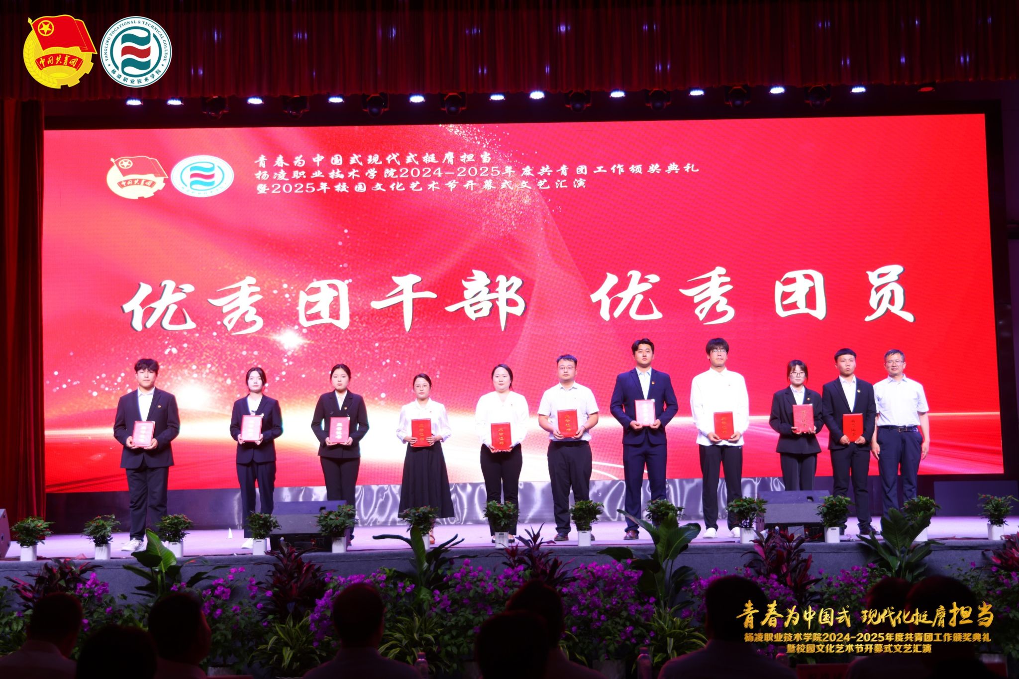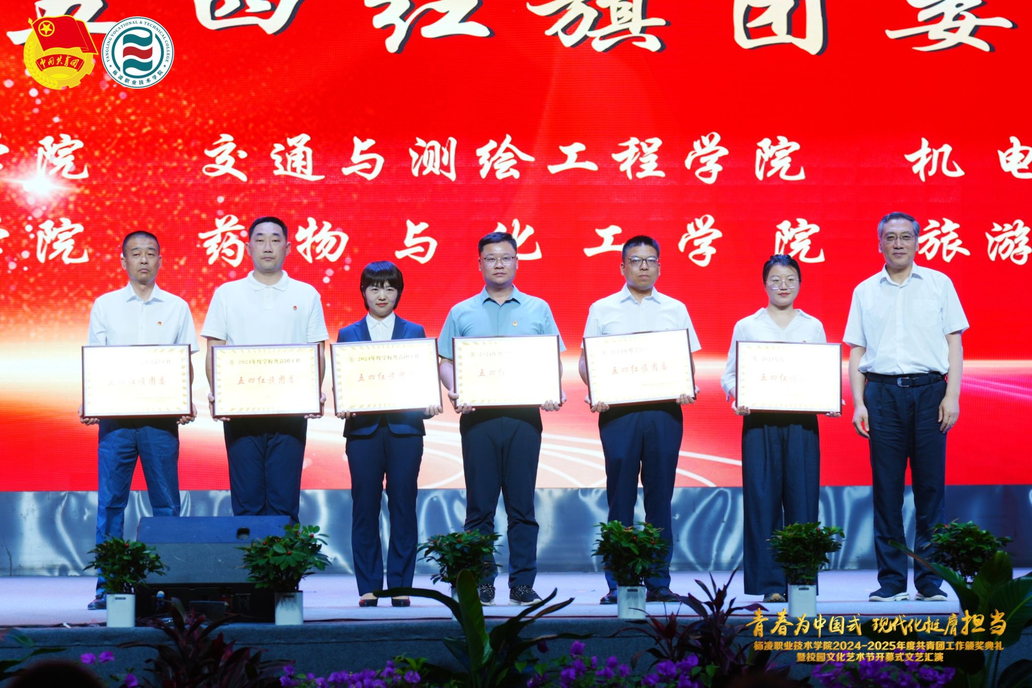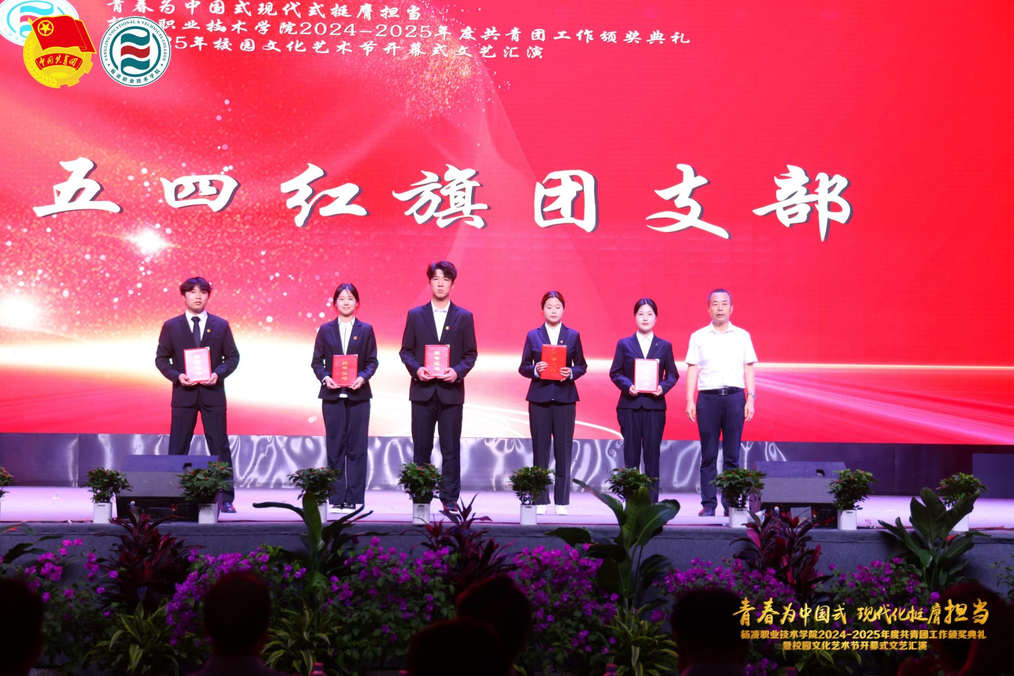在颁奖典礼上,副校长张朝晖致辞全校青年团员,希望大家胸怀凌云之志,锻造过硬本领,做挺膺担当的奋斗者。典礼宣读了《共青团杨凌职业技术学院委员会关于表彰2024-2025学年度先进集体及先进个人的决定》,学校领导为五四红旗团委、五四红旗团支部、优秀共青团干部、优秀共青团员等先进集体和个人颁发奖章。
