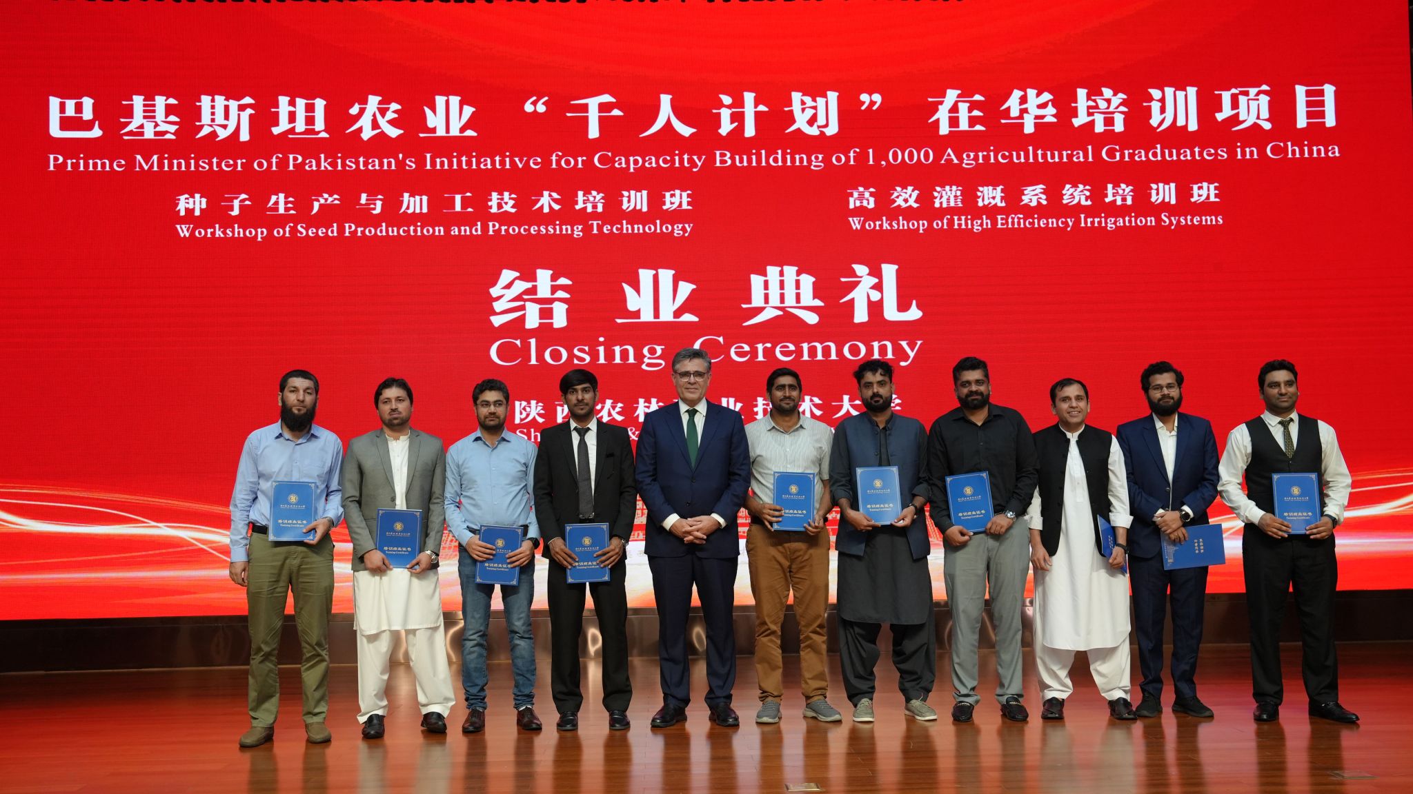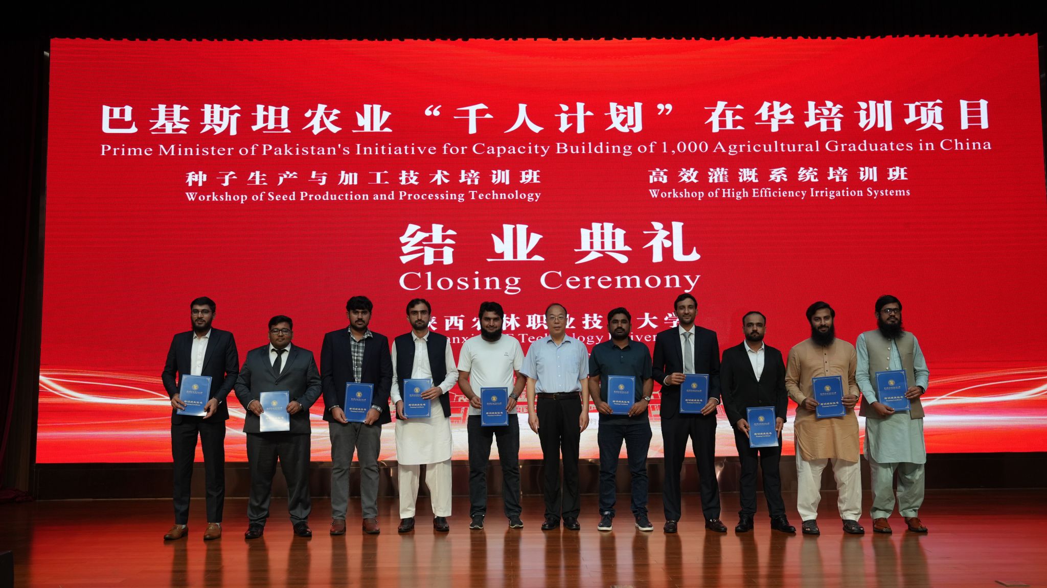 7月17日,巴基斯坦农业“千人计划”在华培训项目结业典礼在我校举行,该项目“高效灌溉系统”“种子生产加工技术”2个专业培训班98名学员顺利结业。巴基斯坦驻华大使卡里尔·哈什米,省外办副主任高进孝,我校校长仲伟周、副校长蒋平江,省外办、省教育厅外事处、杨凌示范区国际局、杨凌国际会展中心酒店相关负责人,以及我校相关部门负责人、教师代表等参加结业典礼。