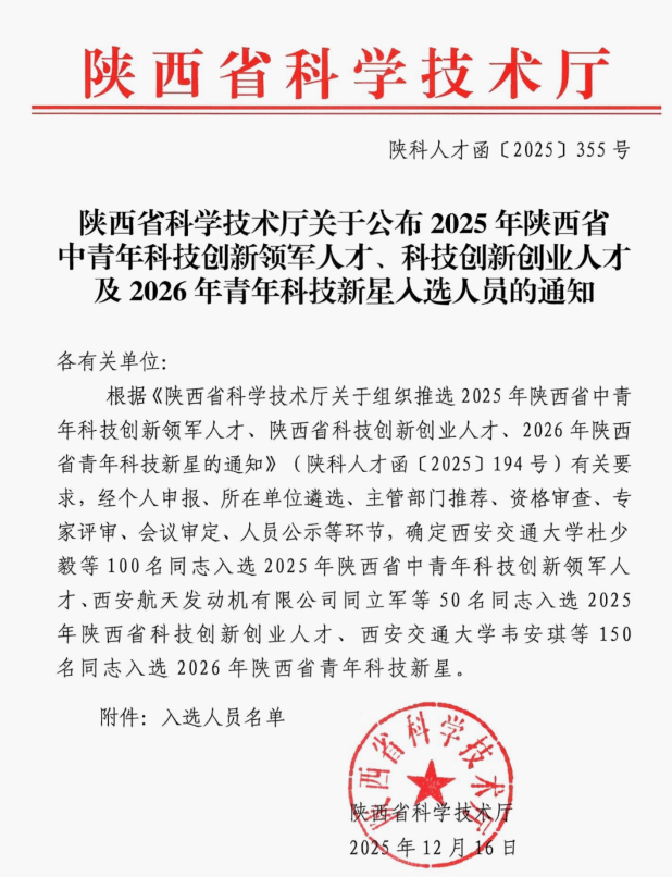 12月16日,省科学技术厅公布了2025年陕西省中青年科技创新领军人才、科技创新创业人才及2026年青年科技新星入选人员。学校动物工程学院青年教师仇薪鑫入选2026年陕西省青年科技新星。