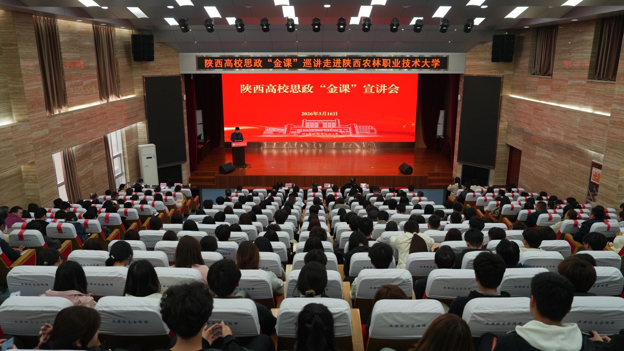 3月16日下午,学校举办陕西高校思政“金课”宣讲会,邀请陕西高校思政“金课”讲师团成员在校宣讲。党委书记韩明军、党委副书记刘瑞明、副校长祝战斌出席活动。党委(校长)办公室、党委组织部、党委宣传部、党委学工部、教务处、团委、马克思主义学院负责人,各学院(部)负责人、全体思政课教师、辅导员代表及学生代表共300余人参加活动。
