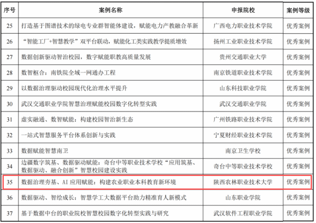 近日,教育部职业院校信息化教学指导委员会公布了全国职业院校智慧校园典型案例遴选结果,共评选出100个典型案例。由我校信息化处牵头申报的《数据治理夯基、AI应用赋能:构建农业职业本科教育新环境》案例成功入选优秀案例。
