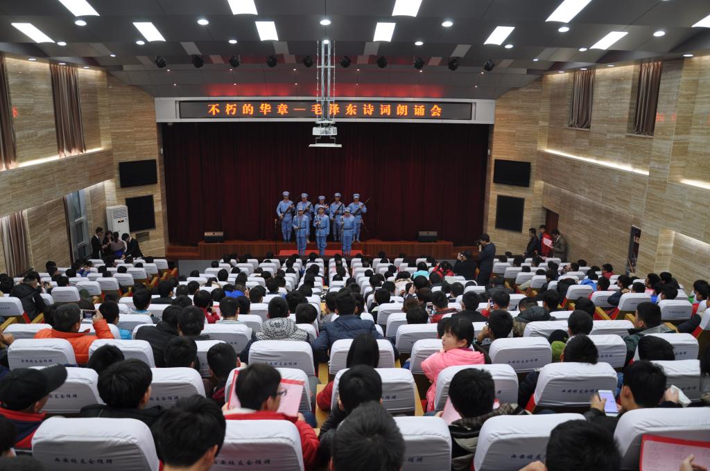 在纪念毛泽东同志诞辰122周年之际,20151221日晚,由思想政治理论课教学部主办、院团委协办的“不朽的华章——毛泽东诗词朗诵会”在醒钟楼思辨堂举行。党委书记赵曼、党委副书记任得元、副院长张永良、张迪出席,各分院负责人、辅导员,思政部全体教师及学生代表共计300余人参加。