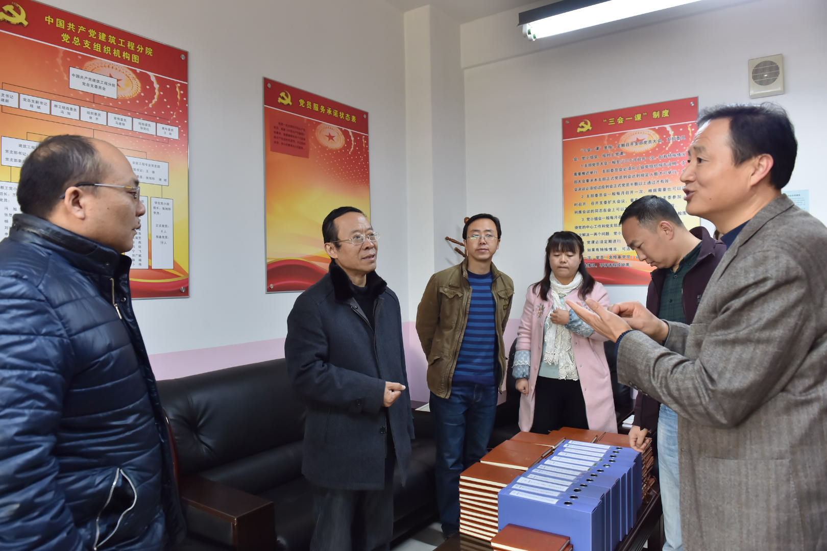 党委书记赵曼介绍了我院“两学一做”学习教育的开展情况,重点就我院落实“六有”、“五带头”要求、基层党建七项重点工作和“三项机制”精神的主要做法、成效和存在问题与整改措施等进行了汇报。随后,黄建民书记一行到建筑工程专业党支部进行检查指导。查阅了“两学一做”学习教育方案、学习笔记、学习心得体会、会议记录等资料,听取了党支部的工作汇报,并与支部相关负责人进行了交流。