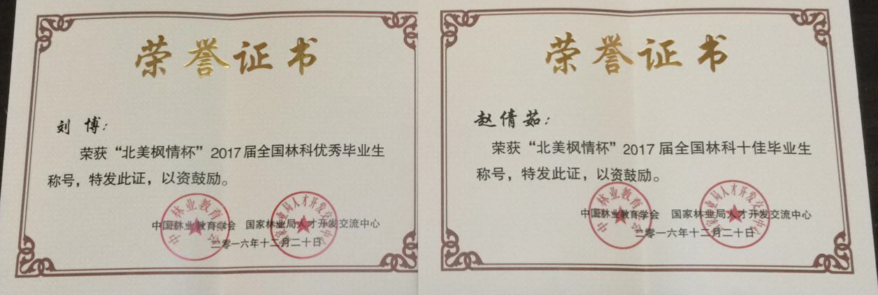 近日,由中国林业教育学会和国家林业局人才开发交流中心共同举办的“北美枫情杯”2016届全国林科十佳毕业生评选表彰大会在山东农业大学举行。我院生态分院园林规划设计专业学生赵倩茹荣获高职组“全国林科十佳毕业生”称号,刘博荣获高职组“全国林科优秀毕业生”称号。