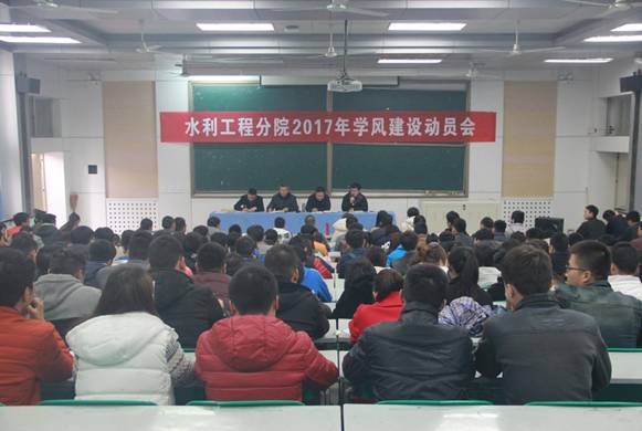 3月13日下午,水利工程分院2017年学风建设动员会启动仪式在南台阶教室举行。分院主要领导,全体辅导员老师以及一、二年级各班学生代表参加了会议。