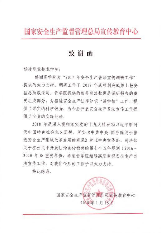 1月15日,国家安全生产监督管理总局宣传教育中心向我院发来致谢函,对我院为“2017年安全生产普法宣传调研工作”提供的相关普法数据表示感谢。函中指出,我院提供的相关普法数据是调研报告的重要组成部分,为推进安全生产法律知识“进学校”工作提供了详实的科学依据,为今后开展安全生产普法宣传工作提供了宝贵的实践经验。并希望我院继续高度重视安全生产普法宣传工作,对国家安监总局宣教中心今后的工作予以大力支持。