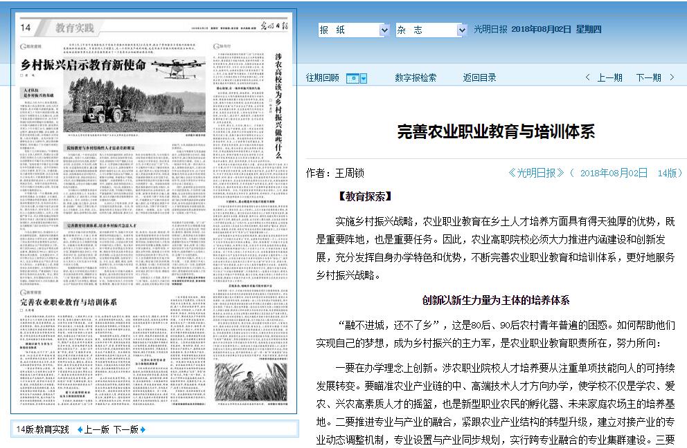 8月2日,《光明日报》14版刊发了我院院长王周锁署名文章《 完善农业职业教育与培训体系 》,全文刊载如下 (详情进入)