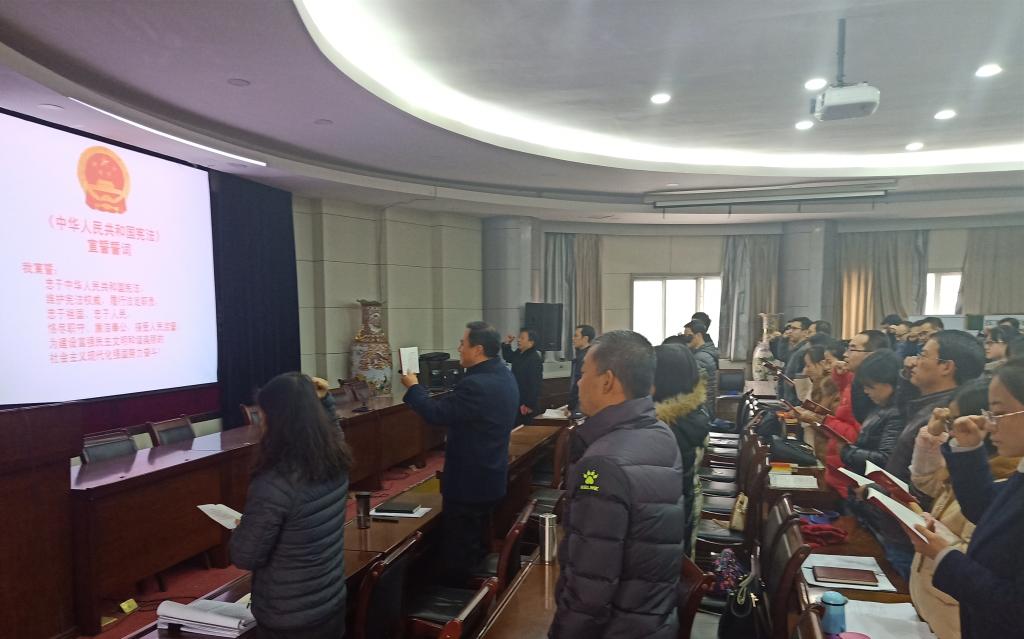 宪法宣誓环节,全体教职工庄严承诺:“我宣誓,忠于中华人民共和国宪法,维护宪法权威,履行法定职责,忠于祖国、忠于人民,恪尽职守、廉洁奉公,接受人民监督,为建设富强民主文明和谐美丽的社会主义现代化强国努力奋斗。”