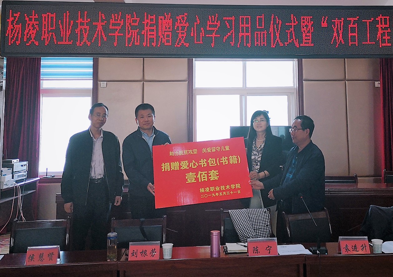 学院关心下一代工作委员会代表学院,向麟游县贫困家庭学生赠送100套书包、书籍等学习用品,继续巩固扶智、扶志、扶根本的扶贫成果。陈宁与麟游县副县长马顶柱进行了交接仪式。