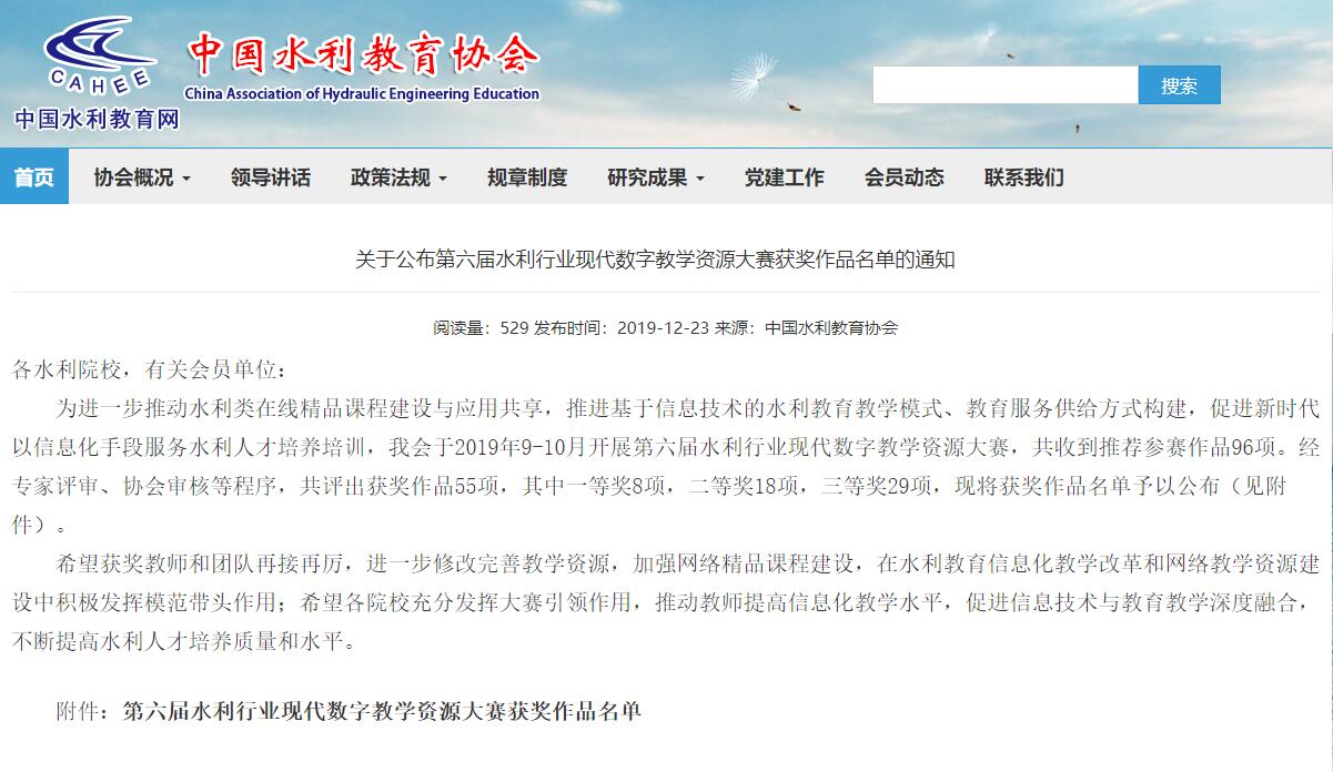本次大赛由中国水利教育协会主办,旨在提升水利院校教师信息化教学水平,以信息化带动水利教育现代化,推进水利行业优质数字教育培训资源。本次大赛共收到推荐参赛作品96项,评出获奖作品55项,其中一等奖8项,二等奖18项,三等奖29项。水利工程分院作为我院主要参赛单位,报送的参赛作品完成了课程在线教学视频、教学PPT、电子教材、习题库等配套资源建设,内容丰富详实,能够较好满足立体化学习需求。