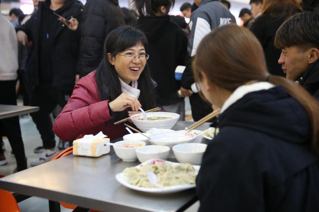 “你们是哪个专业的学生?”“大学的学习生活适应了吗?”“在家里的时候包过饺子吗?经常劳动吗?”……从学习到生活,领导们与学生们亲切交谈。大家一边品尝自己亲手包的饺子,一边拉家常、聊学习、谈生活、话冬至,欢声笑语随着饺子的香味弥漫在整个餐厅里。