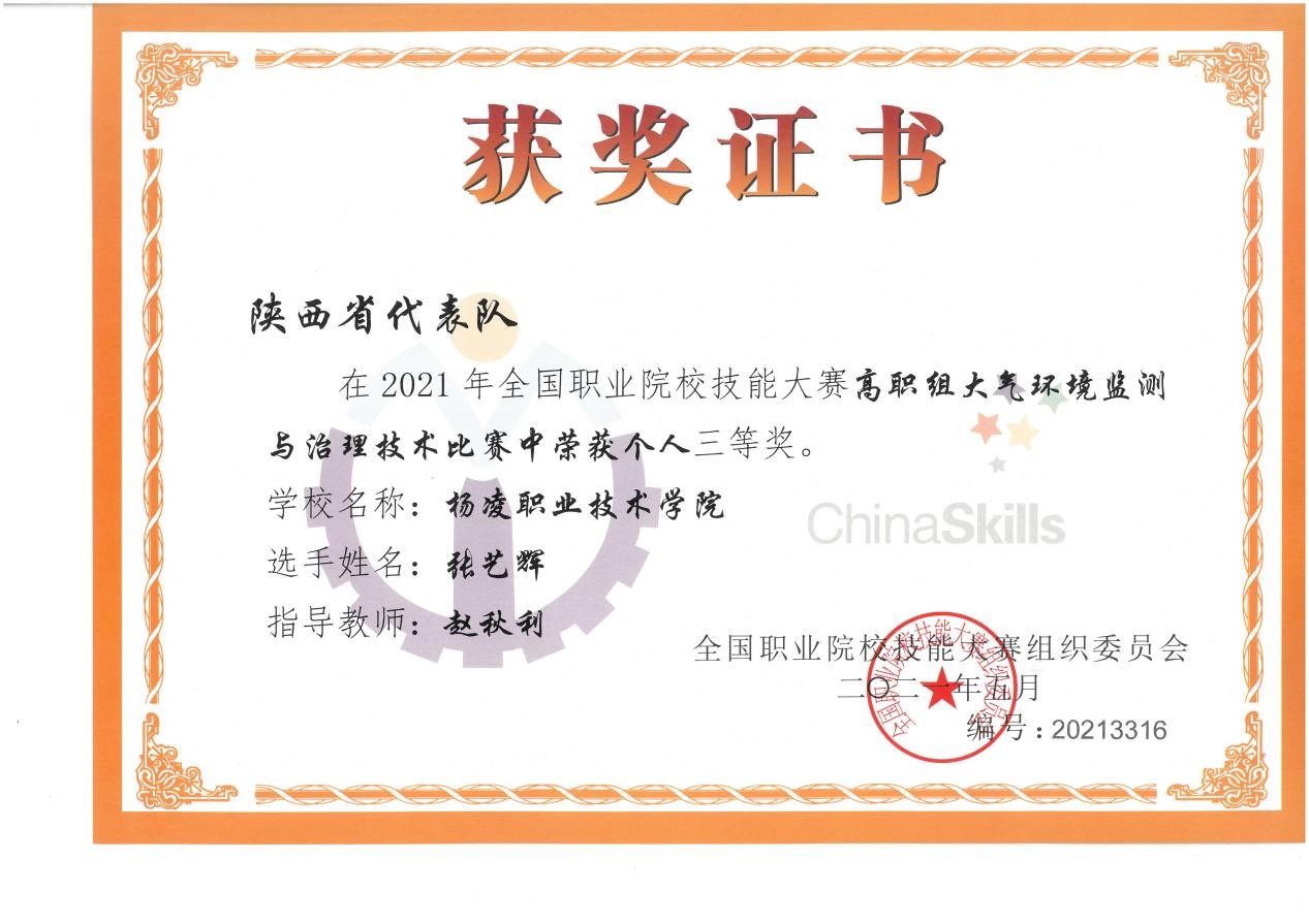 6月25日至27日,2021年全国职业院校技能大赛高职组“大气环境监测与治理技术”赛项在河北工业职业技术大学举办,来自全国各地26支代表队参赛,我校赵秋利老师指导的2019级环境监测与控制技术专业学生张艺辉参赛,荣获大赛三等奖。