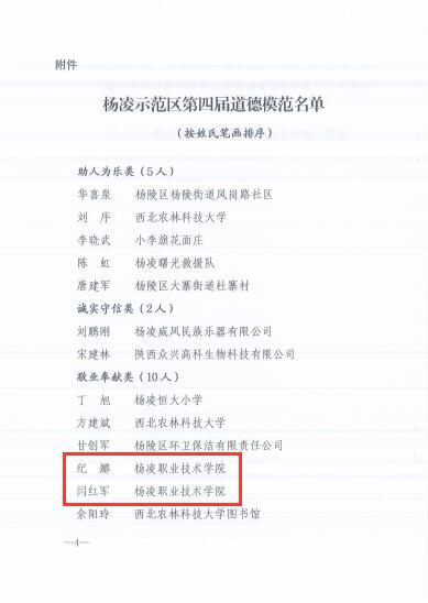 杨凌示范区第四届道德模范评选表彰活动开展以来,经师生个人报名、总支推荐、部门联评、党委会审定,学校推荐16人参加评选活动。最终信息工程学院纪娜和动物工程学院闫红军获“敬业奉献”道德模范,后勤保障处郑党卫、机电工程学院李雅茹获“孝老爱亲”道德模范。