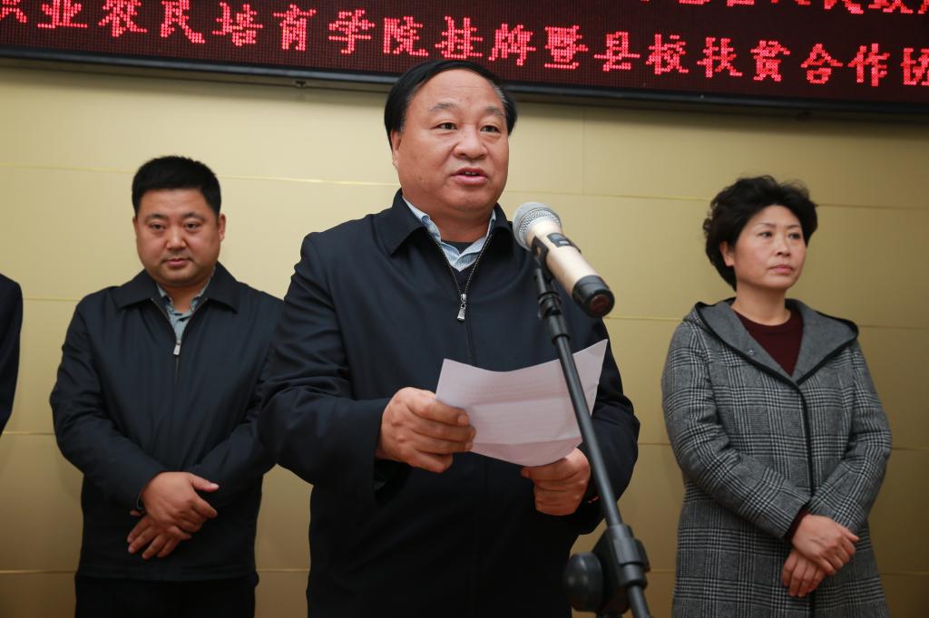 他表示,今天,学院与旬邑县政府签订校县扶贫合作协议,举行职业农民培育学院揭牌仪式,是贯彻落实党的十九大精神最有力的实践,是扶志和扶智机制、责任、义务的固化和承诺,是校县合作从松散合作走向紧密合作、自发服务走向制度化、规范化、可持续化的巩固和发展。学院相关部门要积极对接旬邑县的产业发展需求,健全工作运行机制,制定工作计划和目标,和旬邑县人民政府、县统战部门携手并肩,为“让贫困人口和贫困地区同全国一道进入全面小康社会”做出新的、更大的贡献。