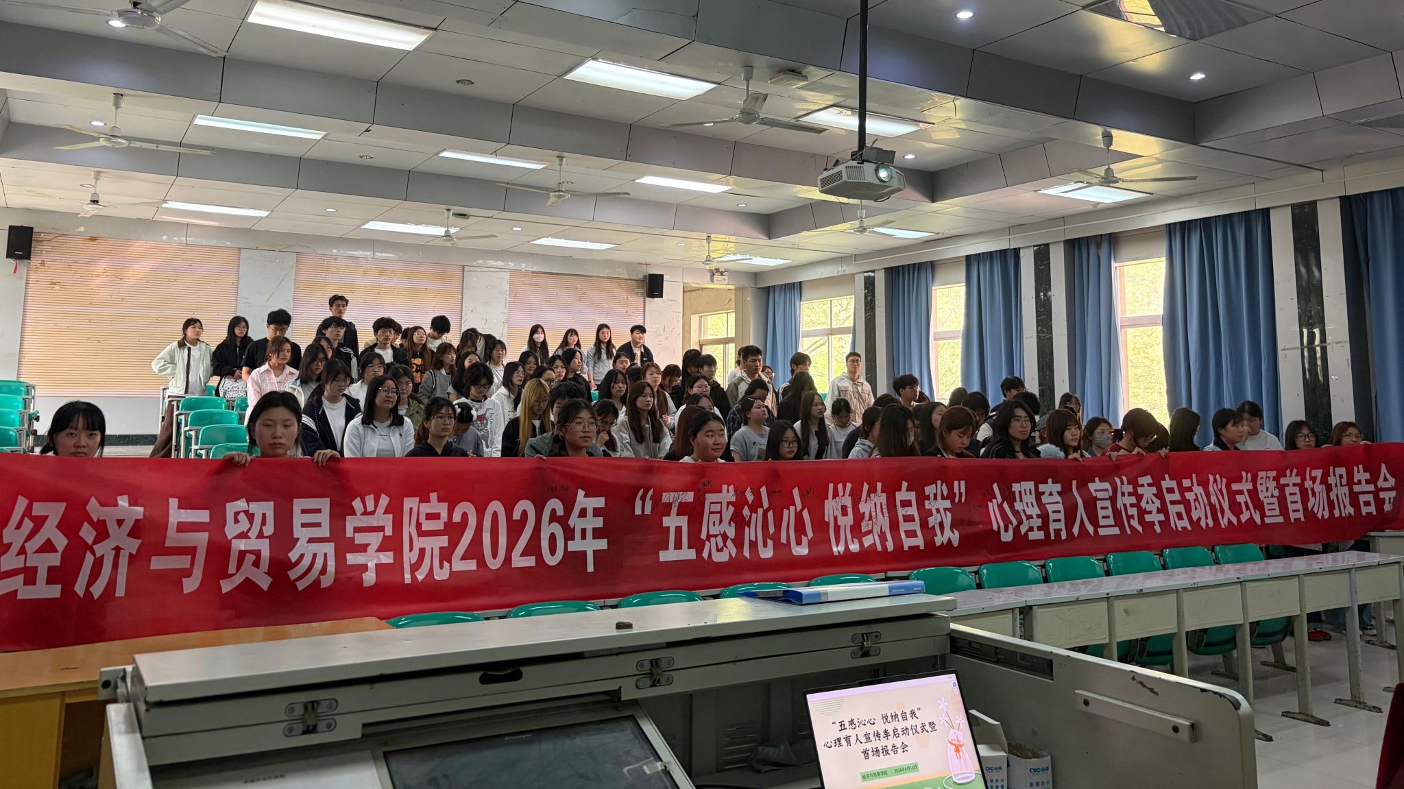 4月13日下午,经济与贸易学院举办“五感沁心 悦纳自我”主题心理育人宣传季启动仪式暨首场专题报告会。学生心理健康教育中心老师,经济与贸易学院学工办老师、各年级学生干部及大一、大二学生代表200余人参加活动。