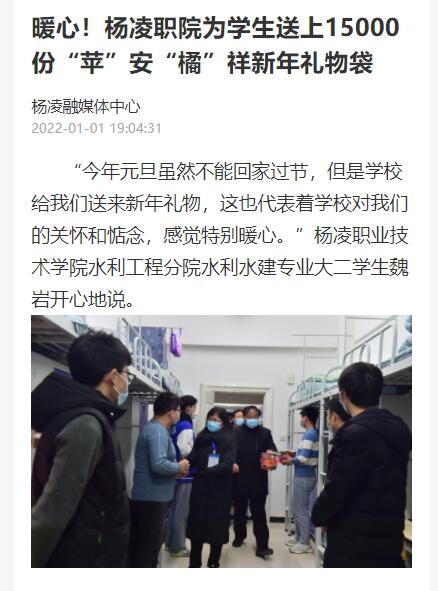 今年元旦虽然不能回过节,但是学校给我们送来新年礼物,这也代表着学校对我们的关怀和惦念,感觉特别暖心杨凌职业技术学院水利工程分院水利水建专业学生魏岩开心地说。