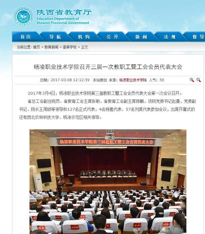2017年3月4日,杨凌职业技术学院第三届教职工暨工会会员代表大会第一次会议召开。