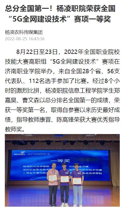8月22日至23日,2022年全国职业院校技能大赛高职组“5G全网建设技术”赛项在济南职业学院举办,来自全国28个省、56支代表队、112名选手参加了比赛。经过8个小时的激烈比拼,杨凌职院信息工程学院学生郑嘉昊、曹文森以总分排名全国第一的成绩,荣获一等奖第一名,取得自参赛以来历史最好成绩,指导教师康晋、陈高锋荣获大赛优秀指导教师奖。