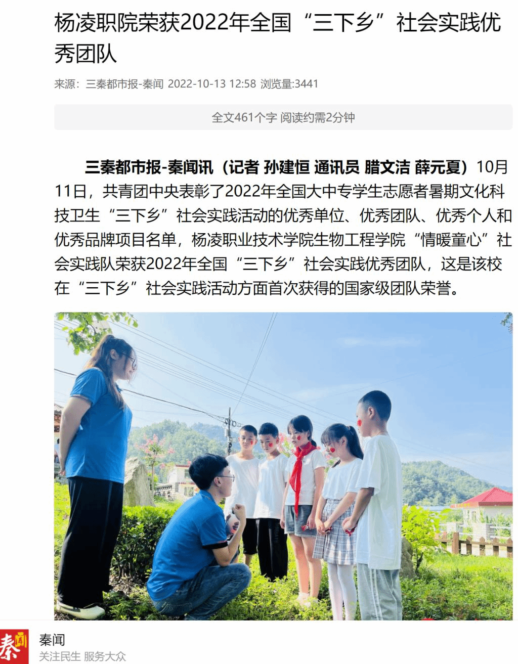 【秦闻】杨凌职院荣获2022年全国“三下乡”社会实践优秀团队