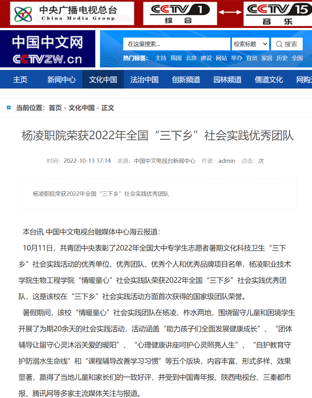 【中国中文网】杨凌职院荣获2022年全国“三下乡”社会实践优秀团队