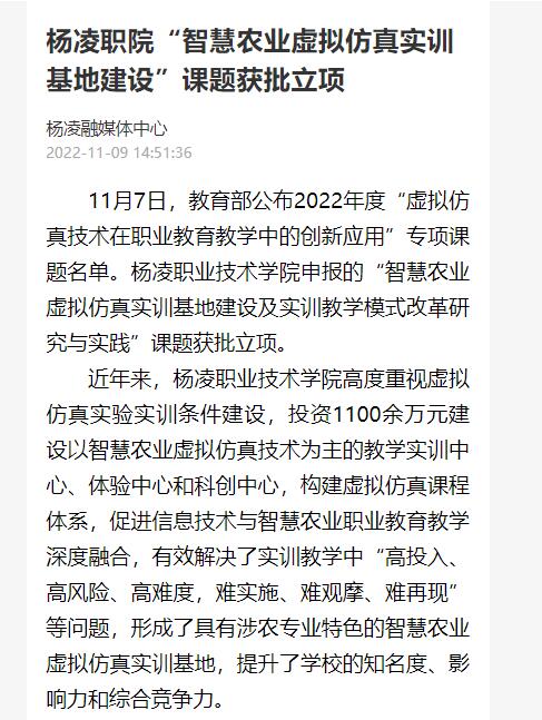 11月7日,教育部公布2022年度“虚拟仿真技术在职业教育教学中的创新应用”专项课题名单。杨凌职业技术学院申报的“智慧农业虚拟仿真实训基地建设及实训教学模式改革研究与实践”课题获批立项。