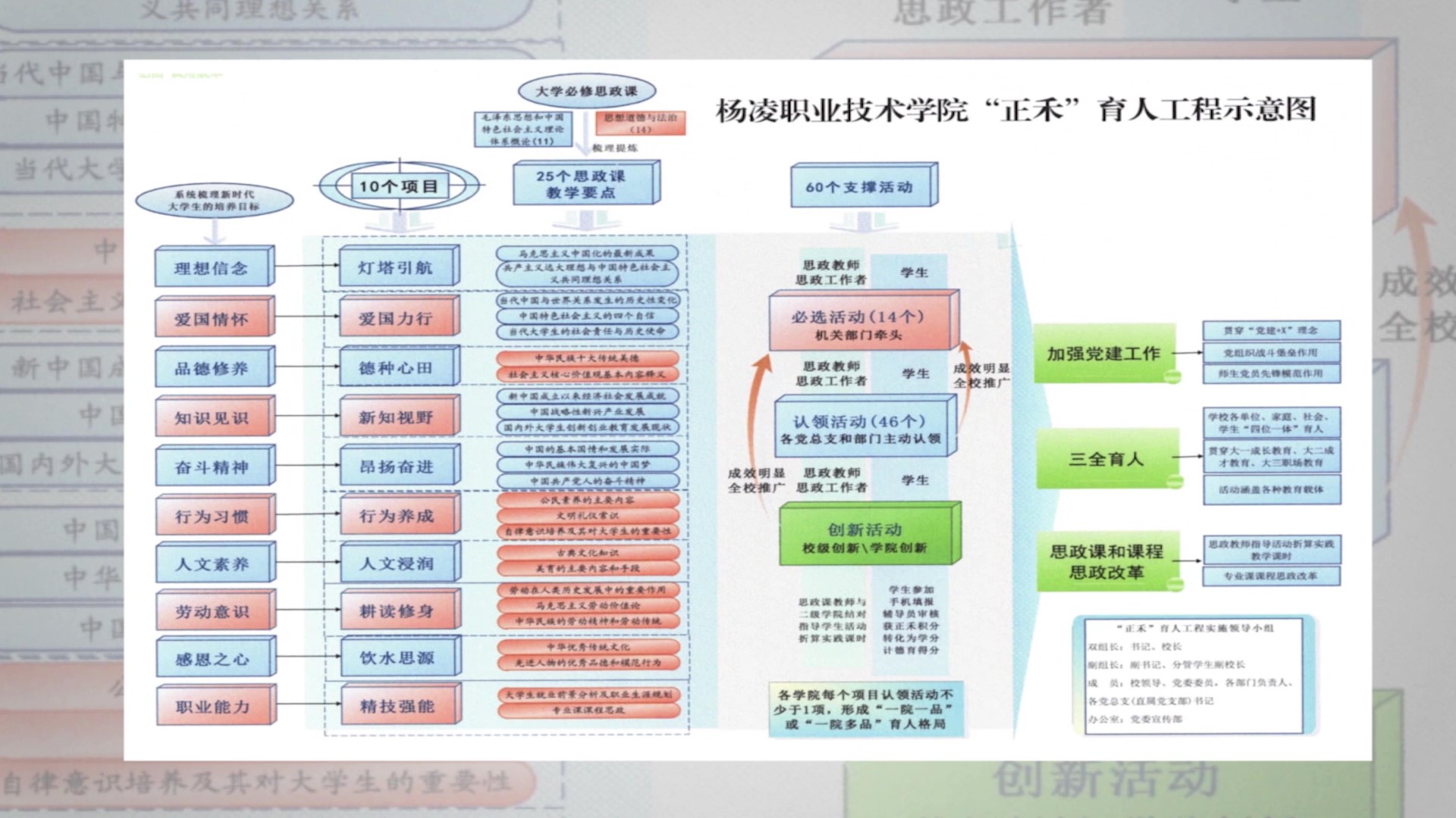 ——与落实立德树人根本任务相结合。紧扣立德树人根本任务,坚持党建引领、社会主义核心价值观固本、“五育”并举强基、“十大育人”体系聚力,适时出台一系列更科学、显特色、提效质的制度,全面推行“党建+X”工作模式,深入实施陕西高校“大思政课”建设“一校一品牌”创建项目——“正禾”育人工程,加快推进陕西高职院校“大思政课”建设协同发展联盟建设,扎实开展“后稷文化”品牌创建,配优建强五支关键育人队伍,积极设立一批校内外思政育人平台,“三全育人”工作新格局逐步形成。学生专业技能和综合素质得到了双提升,在全国多项大赛中荣获特等奖、一等奖和总冠军。