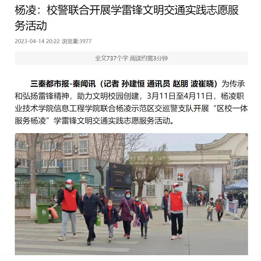 三秦都市报-秦闻讯(记者 孙建恒 通讯员 赵朋波 崔晓)为传承和弘扬雷锋精神,助力文明校园创建,3月11日至4月11日,杨凌职业技术学院信息工程学院联合杨凌示范区交巡警支队开展“区校一体服务杨凌”学雷锋文明交通实践志愿服务活动。