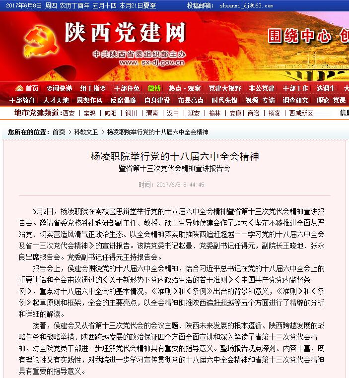 6月2日,杨凌职院在南校区思辩堂举行党的十八届六中全会精神暨省第十三次党代会精神宣讲报告会。邀请省委党校科社教研部副主任、教授、硕士生导师侯建会作了题为《坚定不移推进全面从严治党、切实营造风清气正政治生态、以全会精神落实助推陕西追赶超越——学习党的十八届六中全会及省第十三次党代会精神》的宣讲报告。该院党委书记赵曼、党委副书记任得元,副院长王晓地、张永良出席报告会。党委副书记任得元主持报告会。