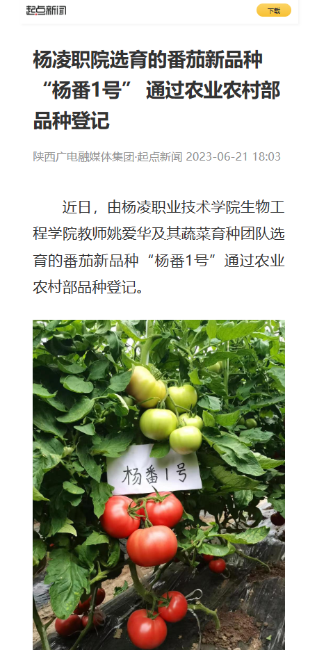 近日,由杨凌职业技术学院生物工程学院教师姚爱华及其蔬菜育种团队选育的番茄新品种“杨番1号”通过农业农村部品种登记。