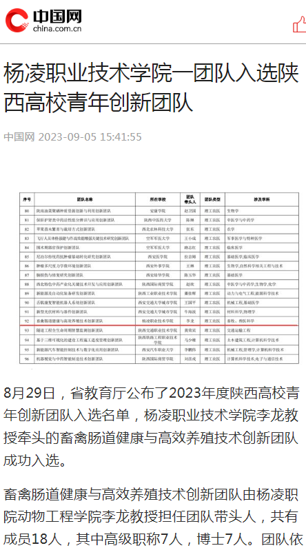 8月29日,省教育厅公布了2023年度陕西高校青年创新团队入选名单,杨凌职业技术学院李龙教授牵头的畜禽肠道健康与高效养殖技术创新团队成功入选。