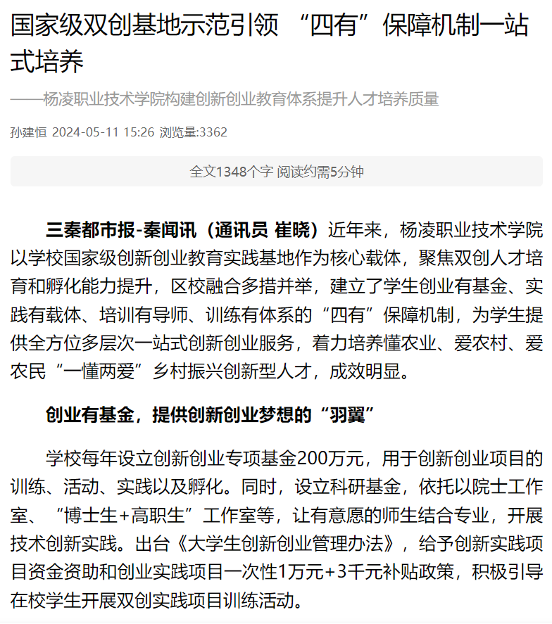 三秦都市报-秦闻讯(通讯员 崔晓)近年来,杨凌职业技术学院以学校国家级创新创业教育实践基地作为核心载体,聚焦双创人才培育和孵化能力提升,区校融合多措并举,建立了学生创业有基金、实践有载体、培训有导师、训练有体系的“四有”保障机制,为学生提供全方位多层次一站式创新创业服务,着力培养懂农业、爱农村、爱农民“一懂两爱”乡村振兴创新型人才,成效明显。