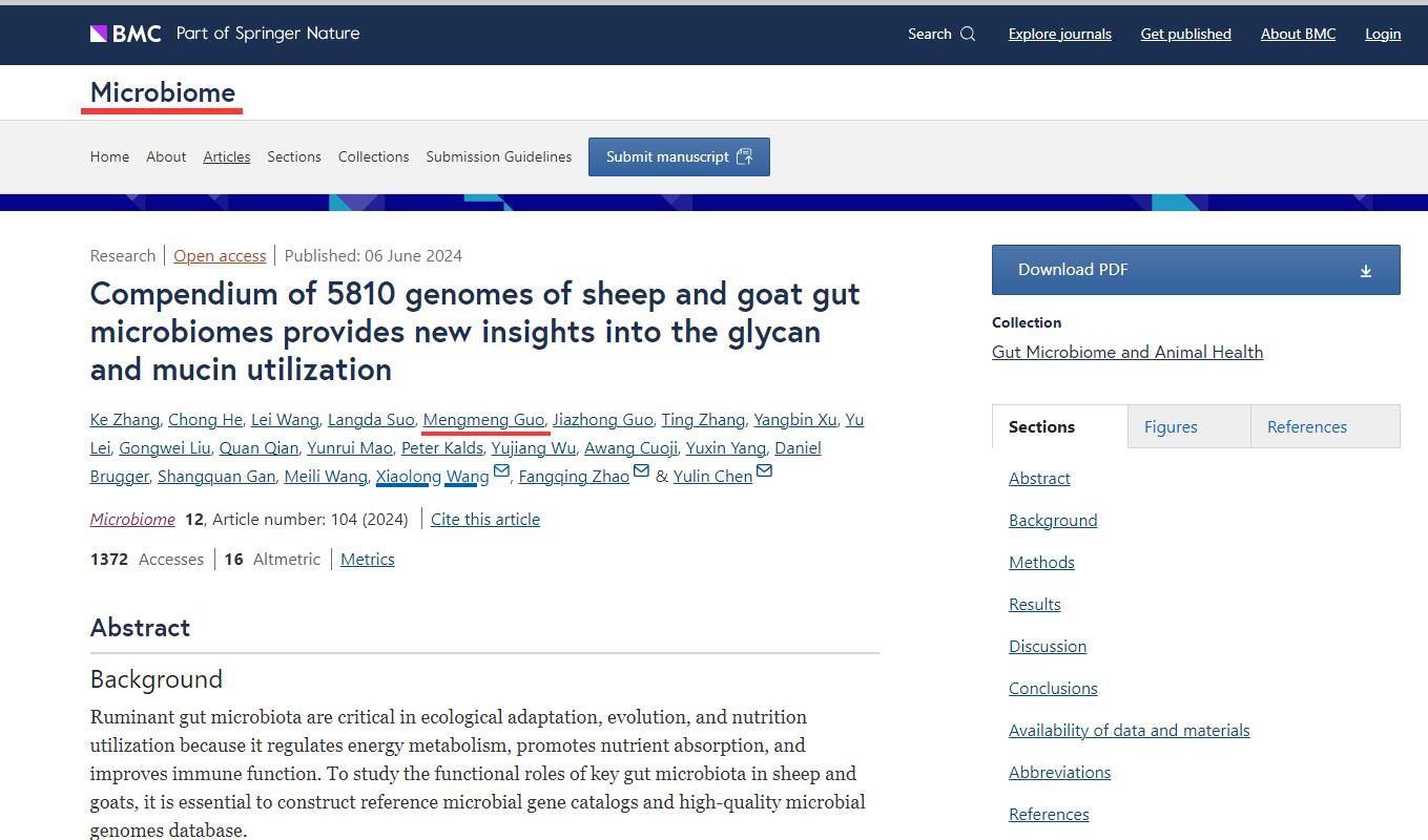 该项成果以“Compendium of 5810 genomes of sheep and goat gut microbiomes provides new insights into the glycan and mucin utilization”为题,创建了迄今为止全球最大的绵羊和山羊肠道微生物基因集目录SMGC和GMGC,通过宏基因组组装技术,成功构建了包含5810个中高质量微生物基因组的数据库,揭示了绵羊肠道内特异性定殖的91种细菌在多糖和黏蛋白代谢方面的潜力,为后续研究共生菌与黏蛋白间的相互作用机制奠定了坚实的基础。
