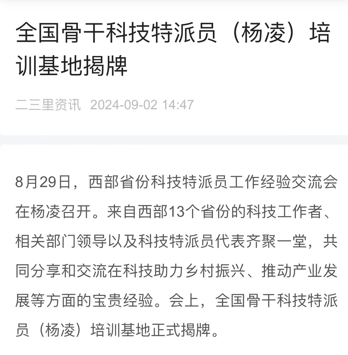 8月29日,西部省份科技特派员工作经验交流会在杨凌召开。来自西部13个省份的科技工作者、相关部门领导以及科技特派员代表齐聚一堂,共同分享和交流在科技助力乡村振兴、推动产业发展等方面的宝贵经验。会上,全国骨干科技特派员(杨凌)培训基地正式揭牌。