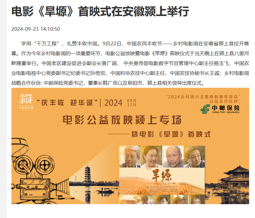 学用“千万工程”,礼赞丰收中国。922日,中国农民丰收节——乡村电影周在安徽省颍上县拉开帷幕。作为今年乡村电影周的一项重要环节,电影公益放映暨电影《旱塬》首映仪式于当天晚上在颍上县八里河畔隆重举行。中国老区建设促进会副会长曾广超, 中央宣传部电影数字节目管理中心副主任杨玉飞,中国农业电影电视中心党委副书记纪委书记孙密宏,中国科协农技中心副主任、中国农技协秘书长王诚;乡村电影周战略合作伙伴: 中邮保险党委书记、董事长韩广岳以及阜阳市、颍上县相关领导出席仪式。