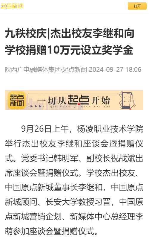 9月26日上午,杨凌职业技术学院举行杰出校友李继和座谈会暨捐赠仪式。党委书记韩明军、副校长祝战斌出席座谈会暨捐赠仪式。学校杰出校友、中国原点新城董事长李继和,中国原点新城顾问、长安大学教授习晋,中国原点新城营销企划、新媒体中心总经理李萌参加座谈会暨捐赠仪式。