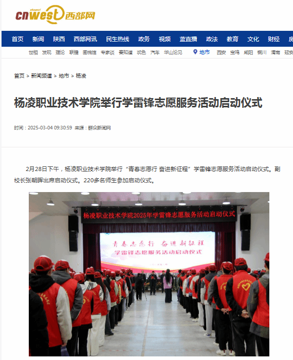 2月28日下午,杨凌职业技术学院举行“青春志愿行 奋进新征程”学雷锋志愿服务活动启动仪式。副校长张朝晖出席启动仪式。220多名师生参加启动仪式。